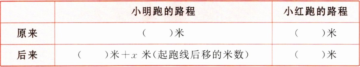 解:设小明的起跑线应比原来后移 x 米。100∶(100 + x) = (100 - 20)∶100,x = 25。答:小明的起跑线应比原来后移 25 米。