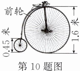 10. 上图是自行车早期发展过程中出现的一种高轮车(部分),骑行时,同一时间内前轮与后轮行驶的路程相同。行驶的路程一定时,轮子的直径与转动的圈数成(