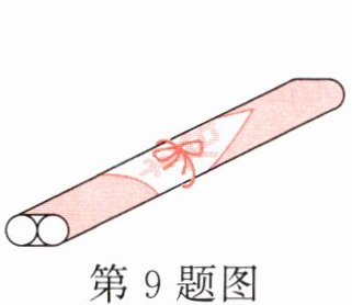 9. 一种圆柱形爆竹长3分米,底面直径是3厘米,2个一组,如图包装,并用红彩带捆扎一圈(打结处彩带长20厘米),至少需要(