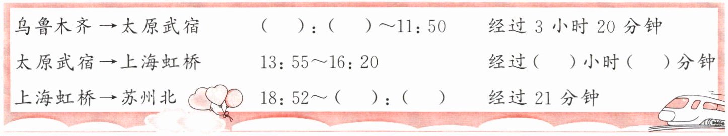 4 暑期,笑笑一家要从乌鲁木齐到苏州,他们选择乘坐飞机和高铁出行。下面是他们乘坐的飞机和高铁的时间的相关信息,请你填写完整。