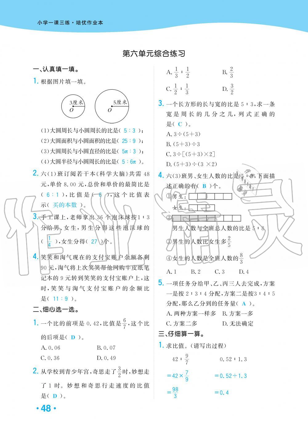 注:目前有些书本章节名称可能整理的还不是很完善,但都是按照顺序排列的,请同学们按照顺序仔细查找。练习册 2019年小学生1课3练培优作业本六年级数学上册北师大版 答案主要是用来给同学们做完题方便对答案用的,请勿直接抄袭。