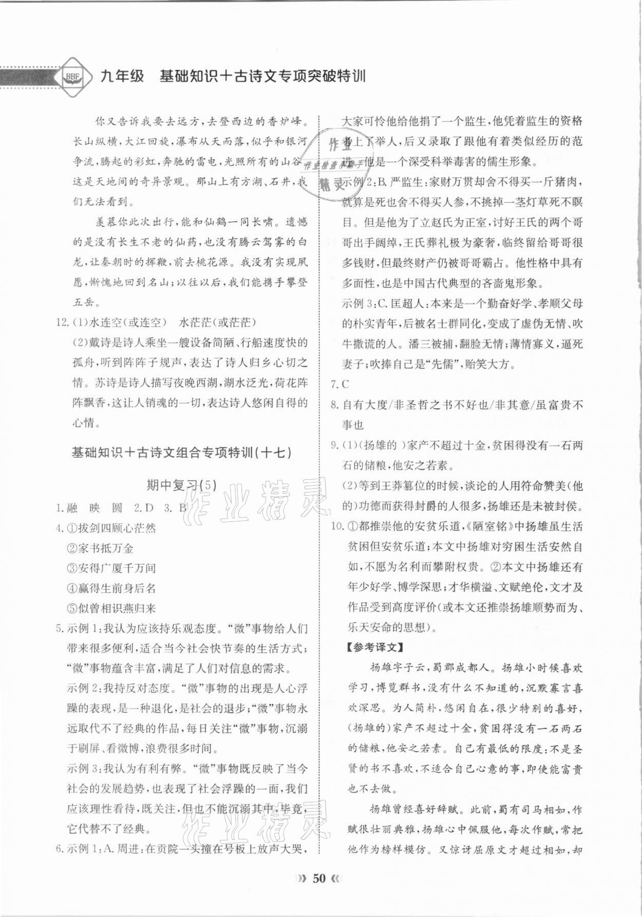 注:目前有些书本章节名称可能整理的还不是很完善,但都是按照顺序排列的,请同学们按照顺序仔细查找。练习册 2020年初中语文中考专项突破特训基础知识加古诗文 答案主要是用来给同学们做完题方便对答案用的,请勿直接抄袭。