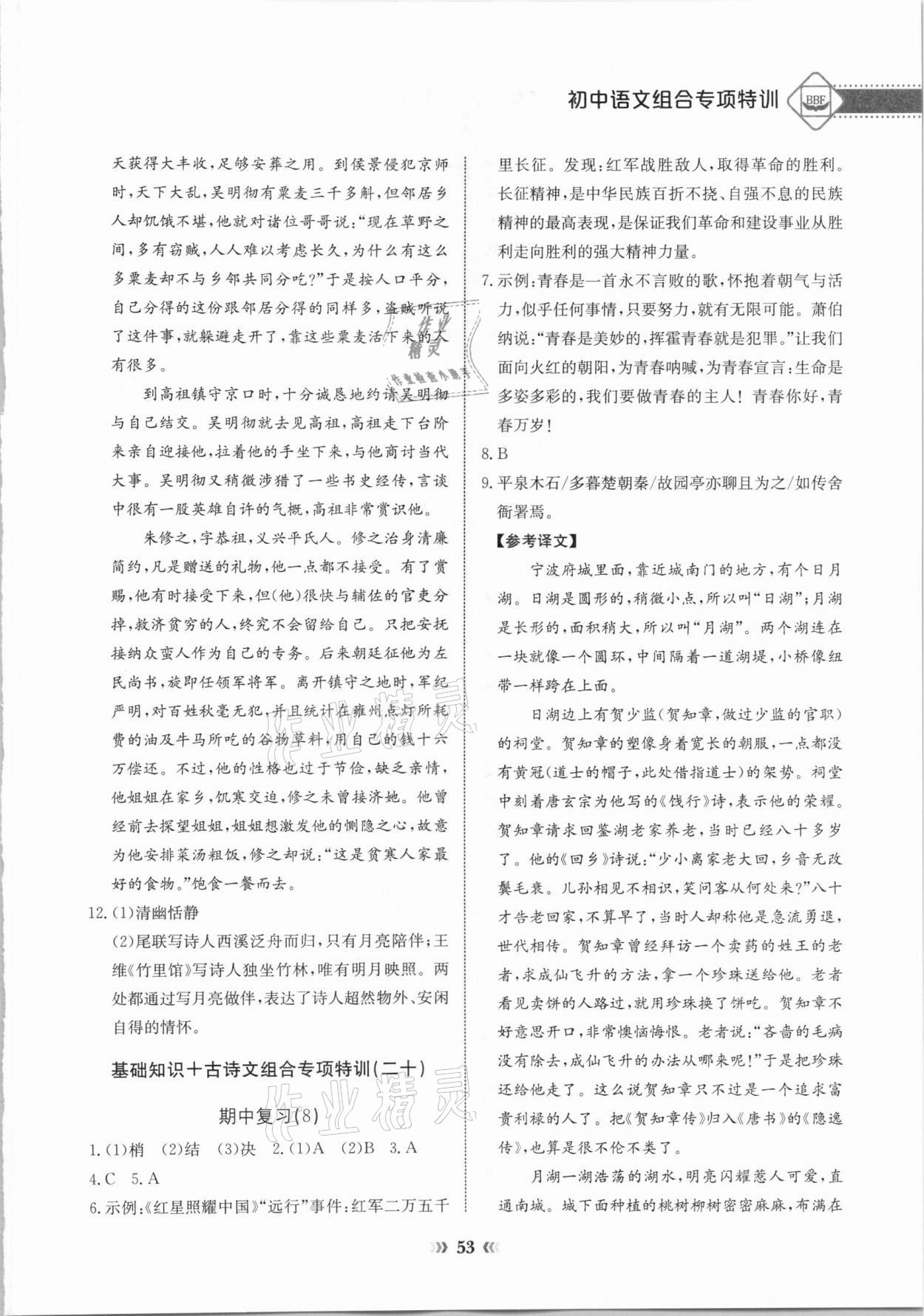 注:目前有些书本章节名称可能整理的还不是很完善,但都是按照顺序排列的,请同学们按照顺序仔细查找。练习册 2020年初中语文中考专项突破特训基础知识加古诗文 答案主要是用来给同学们做完题方便对答案用的,请勿直接抄袭。