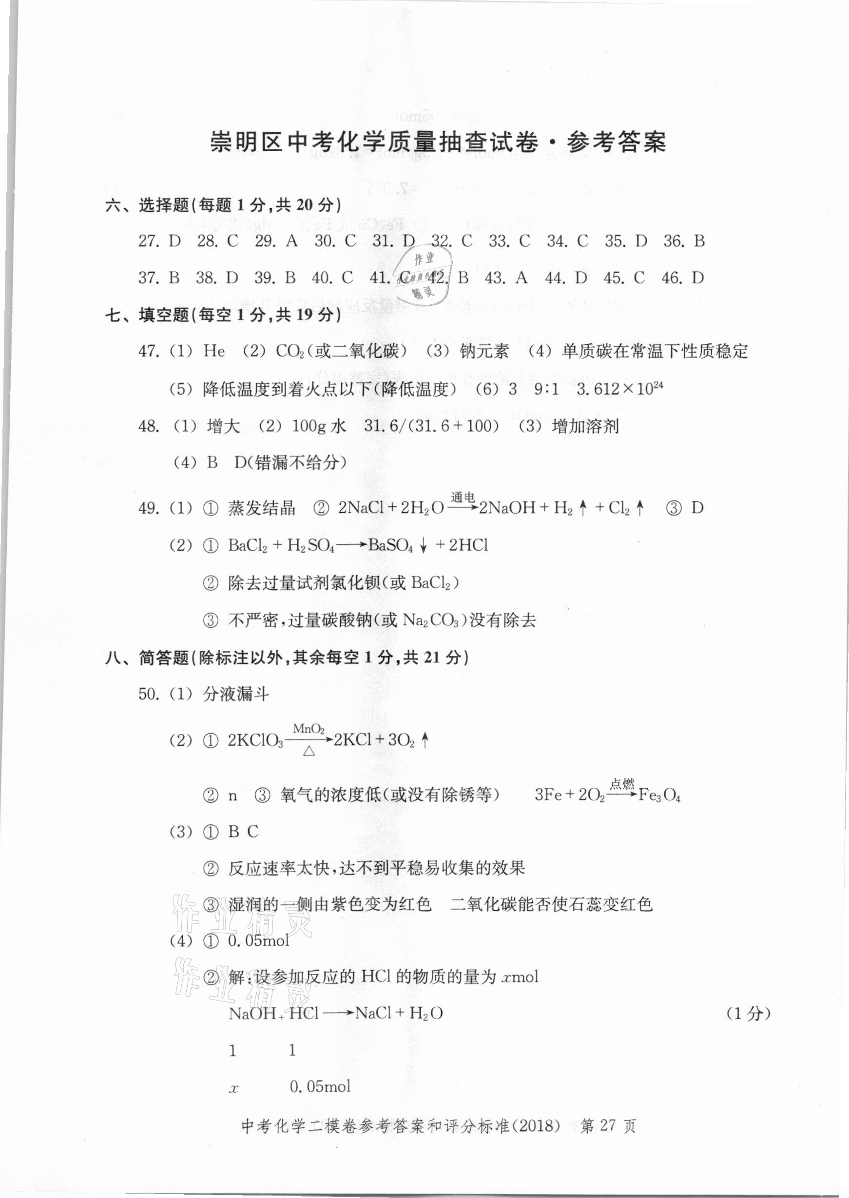 2021年走向成功上海市各区中考考前质量抽查试卷精编化学