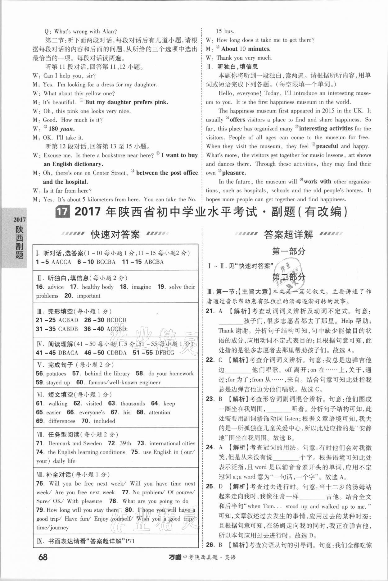 注:目前有些书本章节名称可能整理的还不是很完善,但都是按照顺序排列的,请同学们按照顺序仔细查找。练习册 2021年万唯中考陕西真题英语 答案主要是用来给同学们做完题方便对答案用的,请勿直接抄袭。