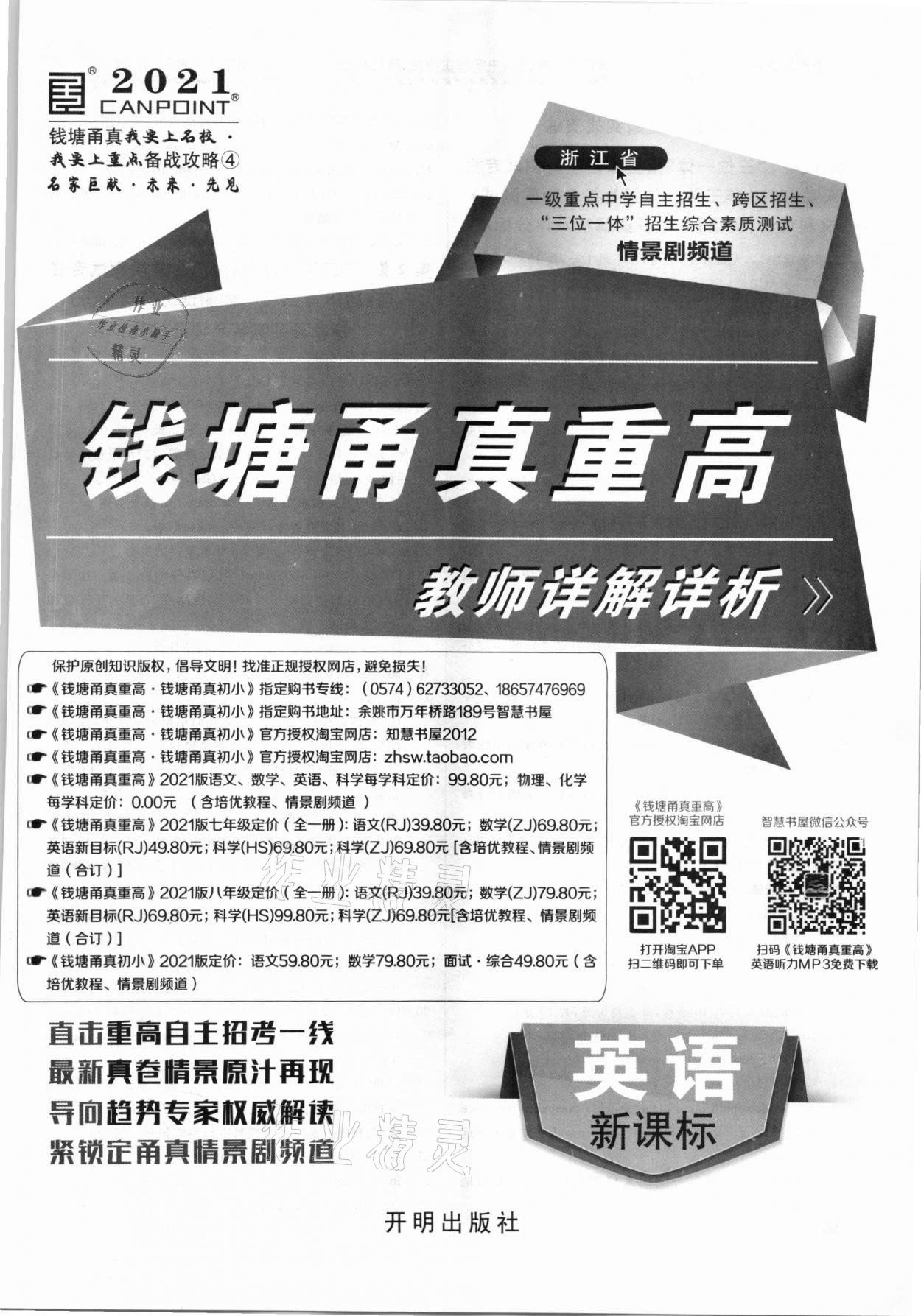 注:目前有些书本章节名称可能整理的还不是很完善,但都是按照顺序排列的,请同学们按照顺序仔细查找。练习册 2021年钱塘甬真重高英语中考 答案主要是用来给同学们做完题方便对答案用的,请勿直接抄袭。