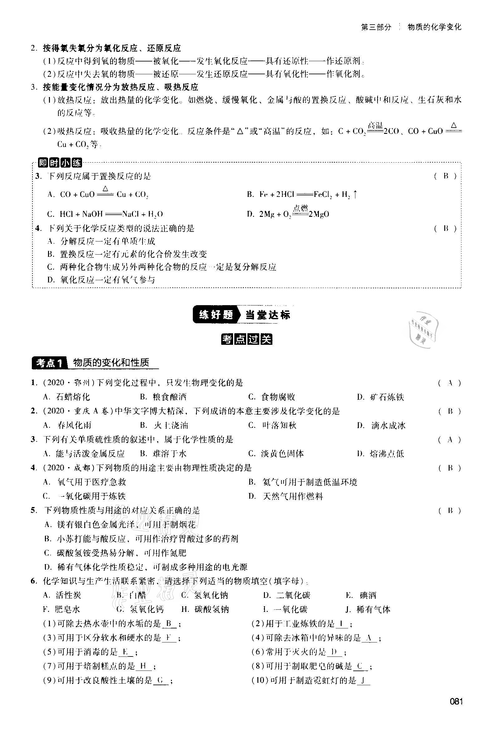 注:目前有些书本章节名称可能整理的还不是很完善,但都是按照顺序排列的,请同学们按照顺序仔细查找。练习册 2021年中考状元化学 答案主要是用来给同学们做完题方便对答案用的,请勿直接抄袭。