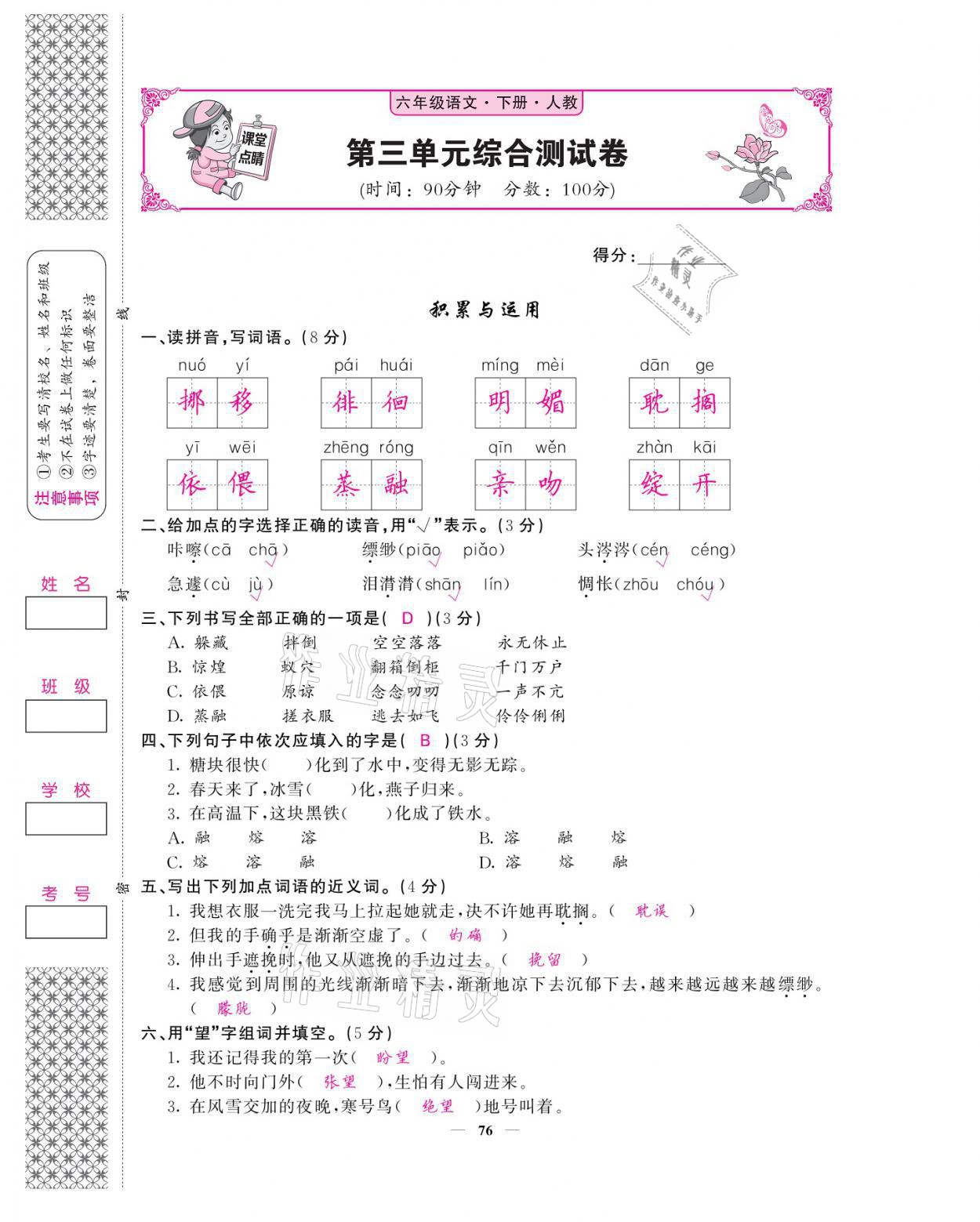 注:目前有些书本章节名称可能整理的还不是很完善,但都是按照顺序排列的,请同学们按照顺序仔细查找。练习册 2021年课堂点睛六年级语文下册人教版广东专版 答案主要是用来给同学们做完题方便对答案用的,请勿直接抄袭。