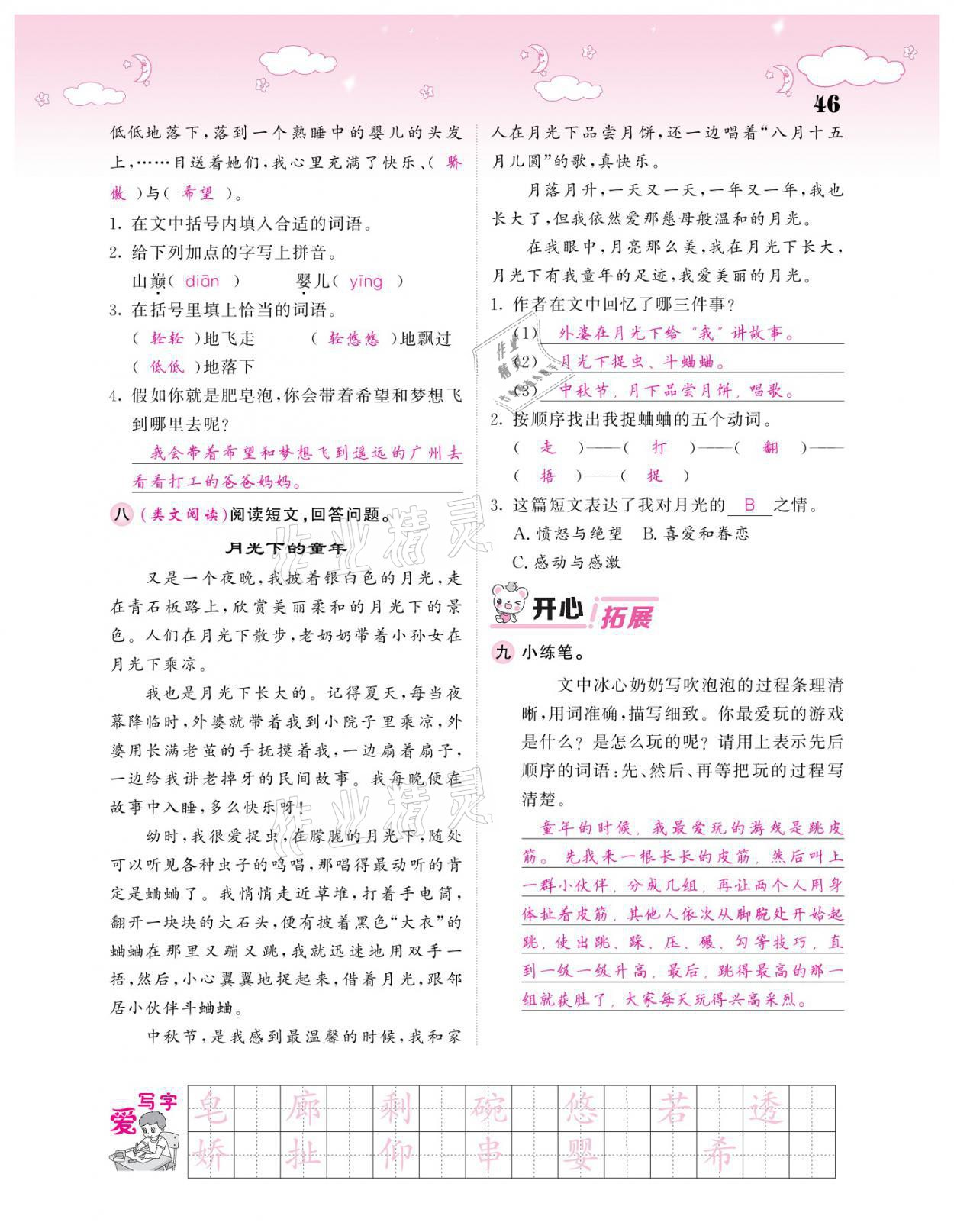 注:目前有些书本章节名称可能整理的还不是很完善,但都是按照顺序排列的,请同学们按照顺序仔细查找。练习册 2021年课堂点睛三年级语文下册人教版广东专版 答案主要是用来给同学们做完题方便对答案用的,请勿直接抄袭。