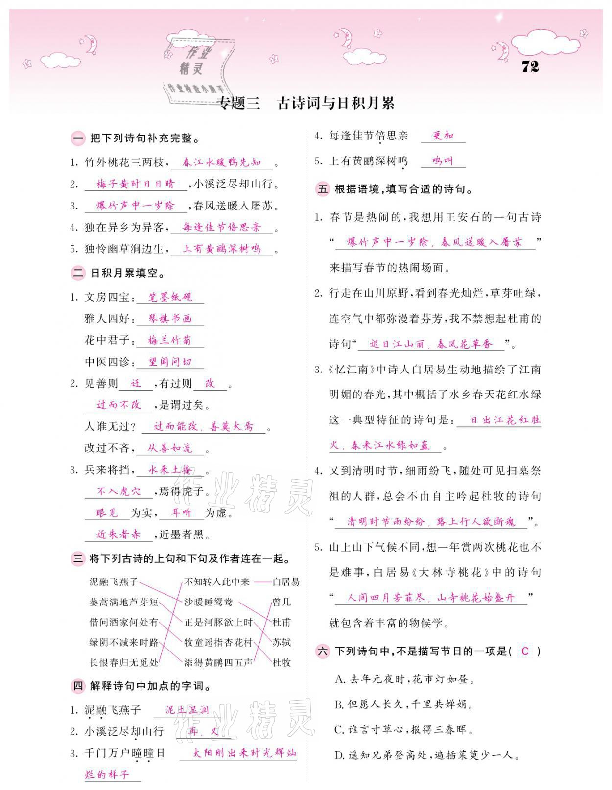 注:目前有些书本章节名称可能整理的还不是很完善,但都是按照顺序排列的,请同学们按照顺序仔细查找。练习册 2021年课堂点睛三年级语文下册人教版广东专版 答案主要是用来给同学们做完题方便对答案用的,请勿直接抄袭。