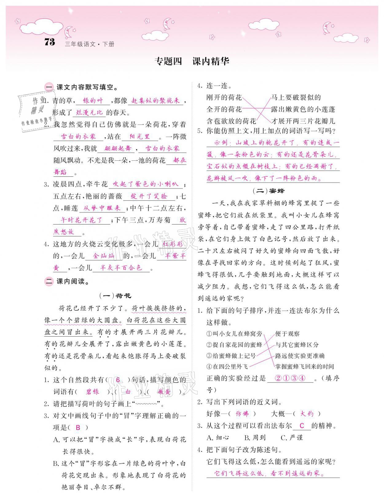 注:目前有些书本章节名称可能整理的还不是很完善,但都是按照顺序排列的,请同学们按照顺序仔细查找。练习册 2021年课堂点睛三年级语文下册人教版广东专版 答案主要是用来给同学们做完题方便对答案用的,请勿直接抄袭。