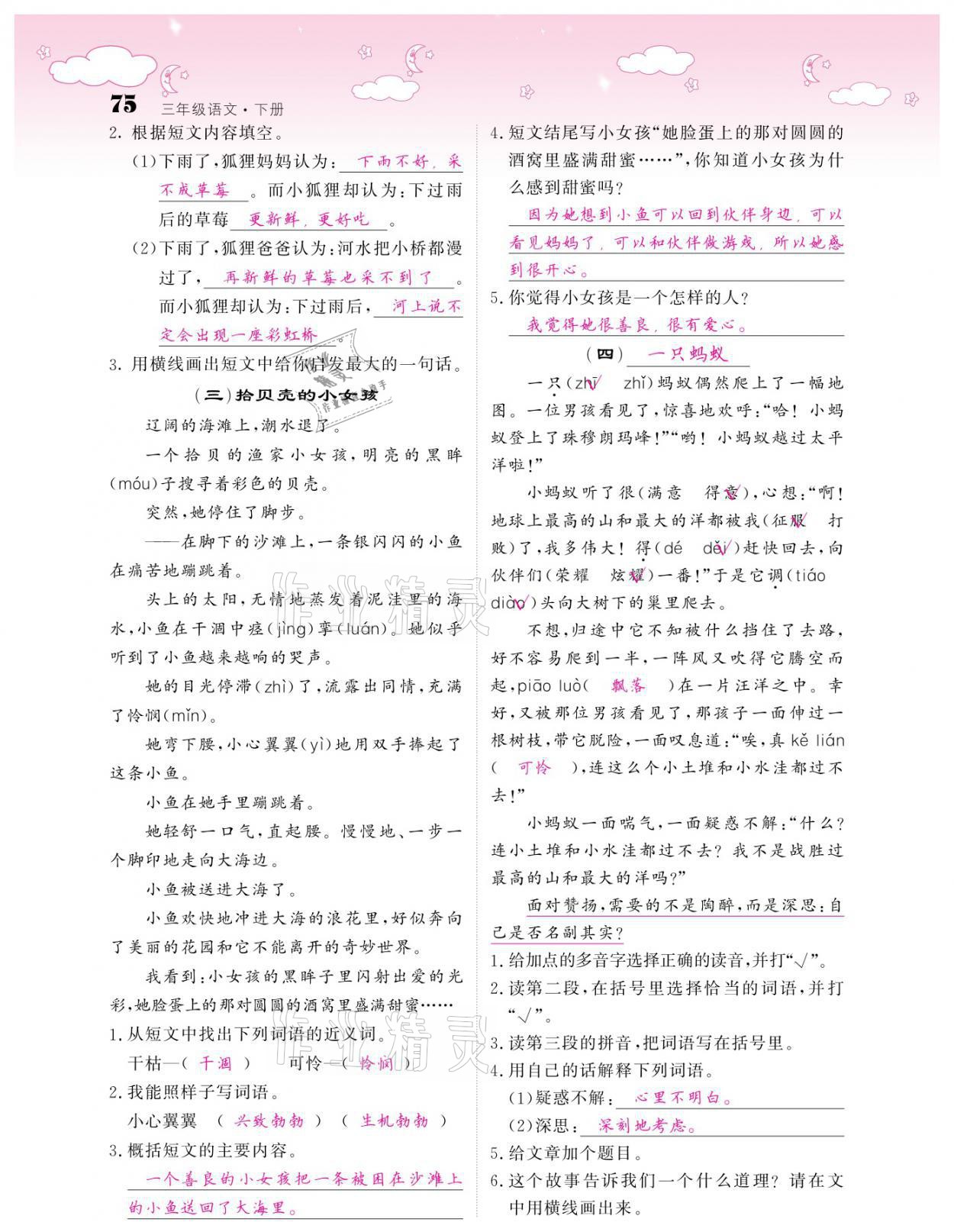 注:目前有些书本章节名称可能整理的还不是很完善,但都是按照顺序排列的,请同学们按照顺序仔细查找。练习册 2021年课堂点睛三年级语文下册人教版广东专版 答案主要是用来给同学们做完题方便对答案用的,请勿直接抄袭。
