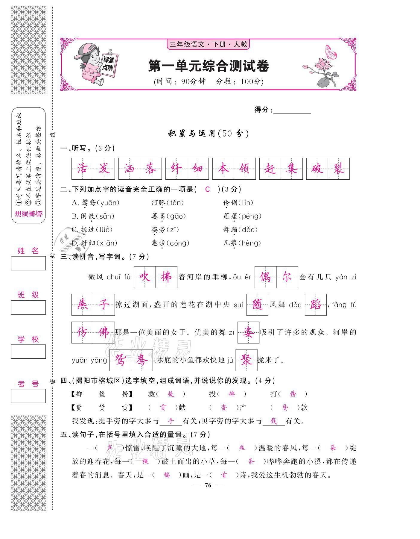 注:目前有些书本章节名称可能整理的还不是很完善,但都是按照顺序排列的,请同学们按照顺序仔细查找。练习册 2021年课堂点睛三年级语文下册人教版广东专版 答案主要是用来给同学们做完题方便对答案用的,请勿直接抄袭。