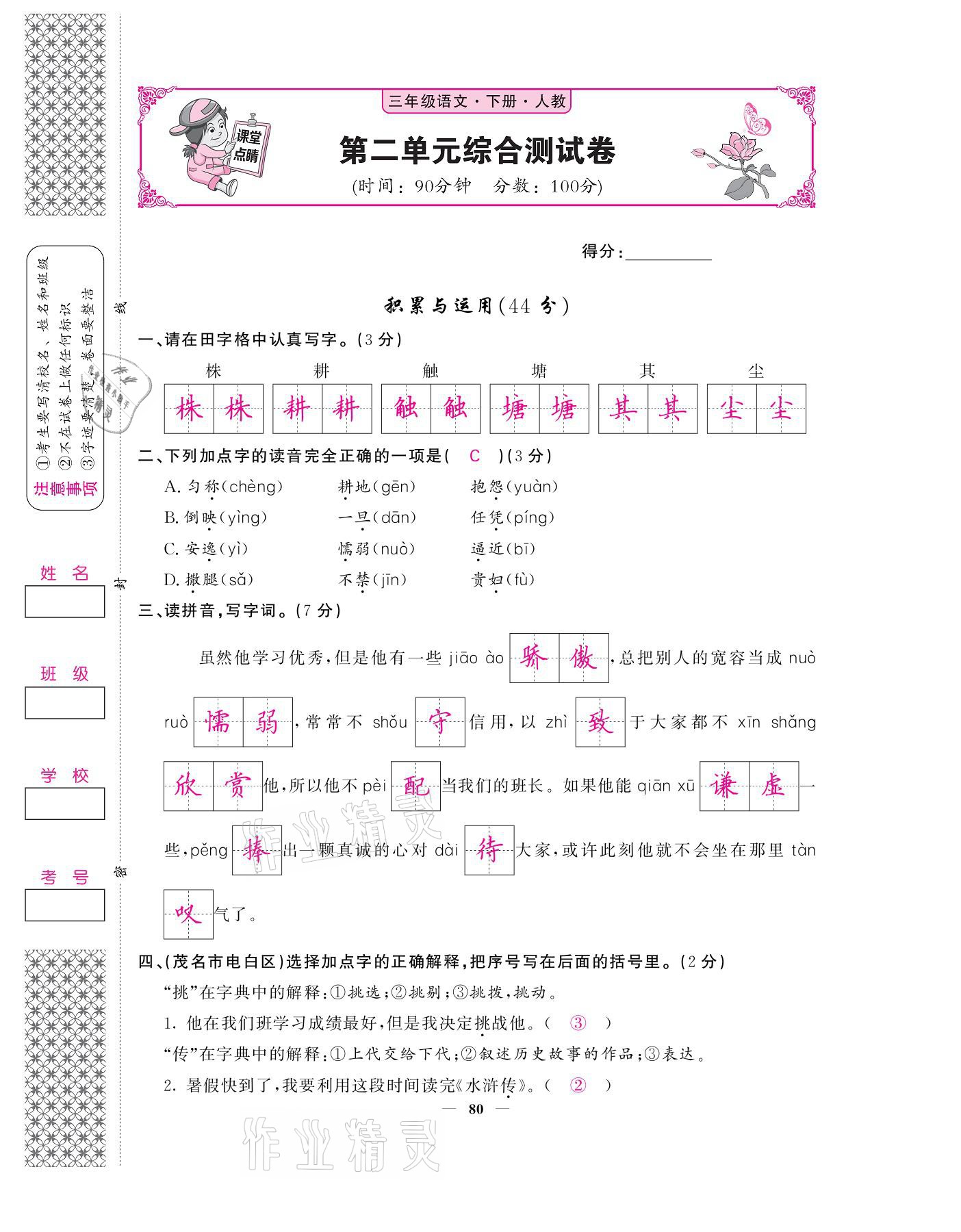 注:目前有些书本章节名称可能整理的还不是很完善,但都是按照顺序排列的,请同学们按照顺序仔细查找。练习册 2021年课堂点睛三年级语文下册人教版广东专版 答案主要是用来给同学们做完题方便对答案用的,请勿直接抄袭。