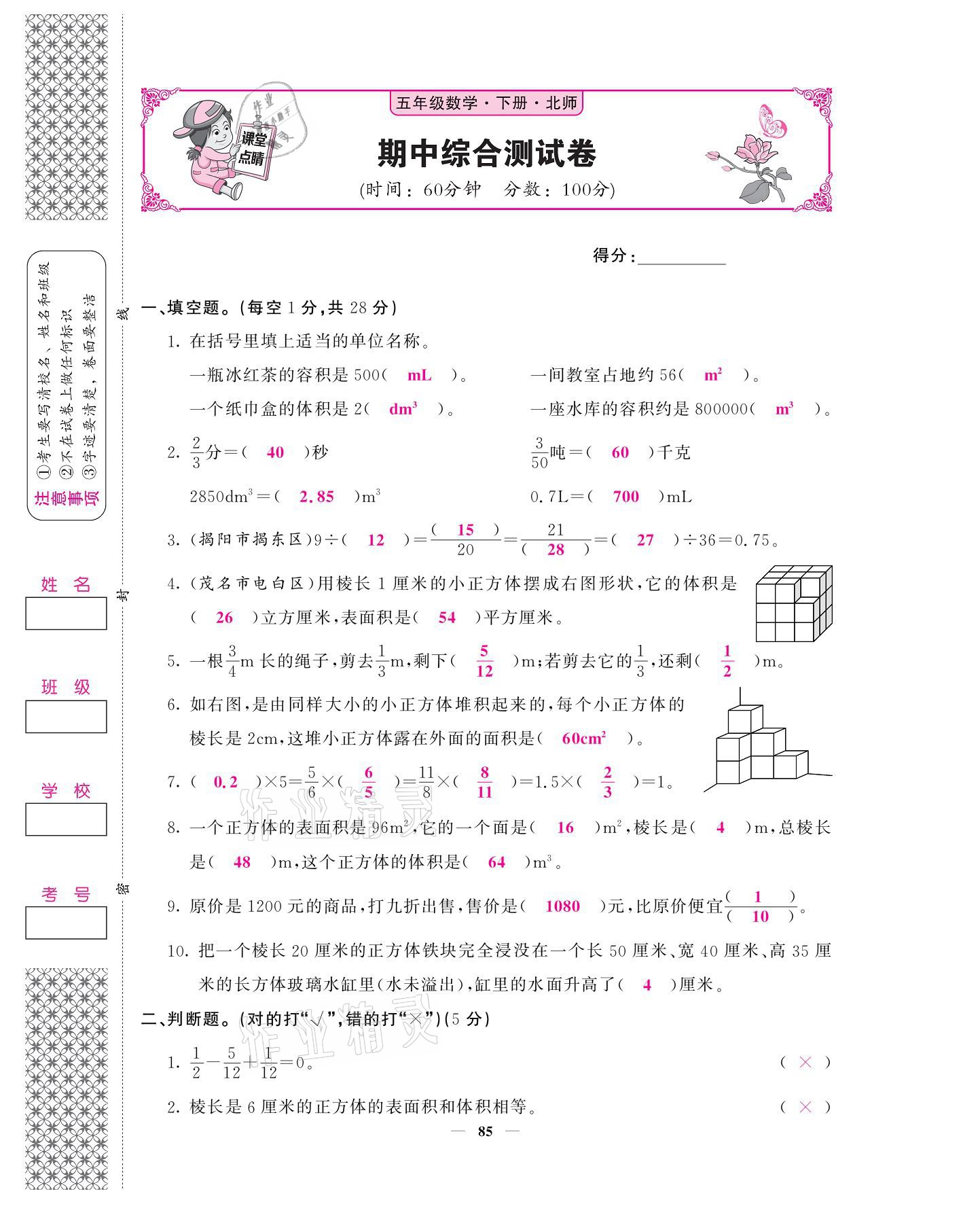 注:目前有些书本章节名称可能整理的还不是很完善,但都是按照顺序排列的,请同学们按照顺序仔细查找。练习册 2021年课堂点睛五年级数学下册北师大版广东专版 答案主要是用来给同学们做完题方便对答案用的,请勿直接抄袭。