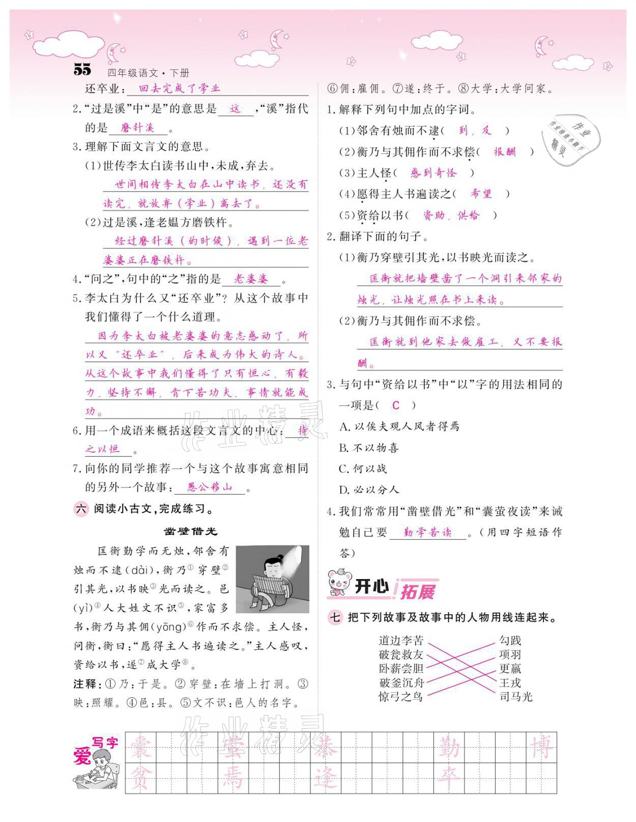 注:目前有些书本章节名称可能整理的还不是很完善,但都是按照顺序排列的,请同学们按照顺序仔细查找。练习册 2021年课堂点睛四年级语文下册人教版广东专版 答案主要是用来给同学们做完题方便对答案用的,请勿直接抄袭。