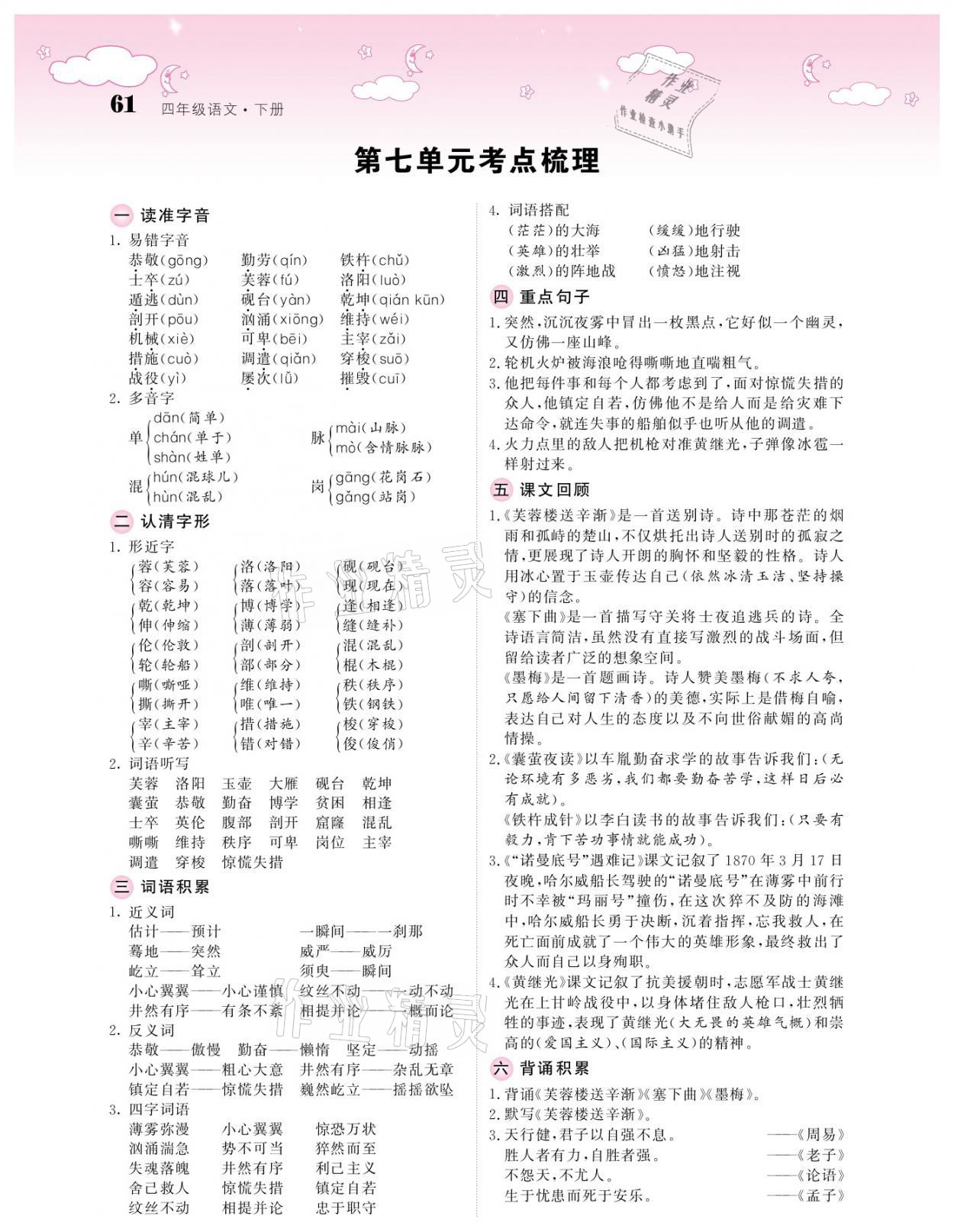 注:目前有些书本章节名称可能整理的还不是很完善,但都是按照顺序排列的,请同学们按照顺序仔细查找。练习册 2021年课堂点睛四年级语文下册人教版广东专版 答案主要是用来给同学们做完题方便对答案用的,请勿直接抄袭。