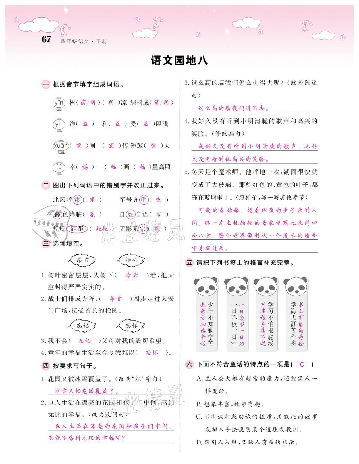 注:目前有些书本章节名称可能整理的还不是很完善,但都是按照顺序排列的,请同学们按照顺序仔细查找。练习册 2021年课堂点睛四年级语文下册人教版广东专版 答案主要是用来给同学们做完题方便对答案用的,请勿直接抄袭。