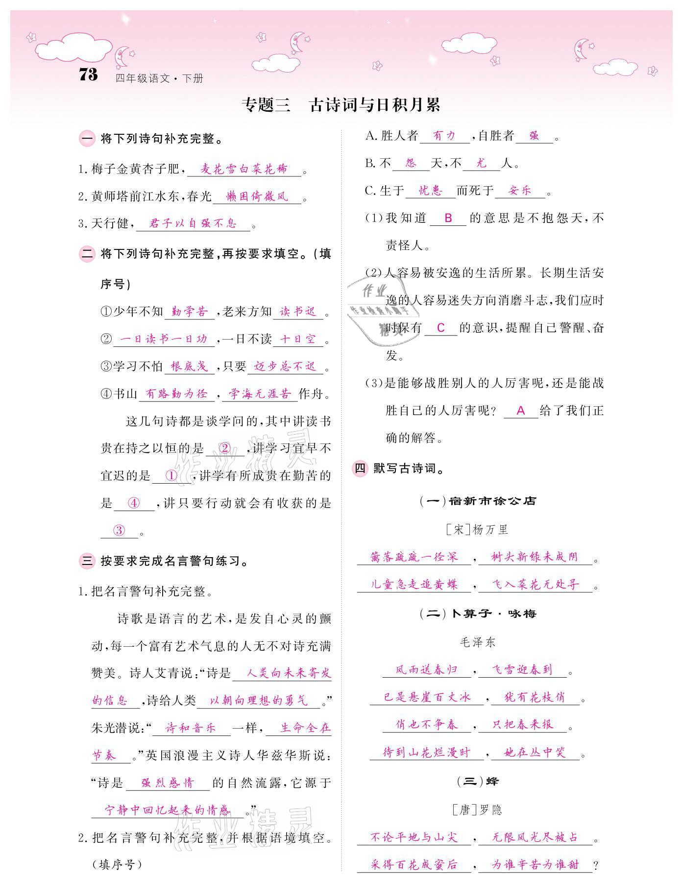 注:目前有些书本章节名称可能整理的还不是很完善,但都是按照顺序排列的,请同学们按照顺序仔细查找。练习册 2021年课堂点睛四年级语文下册人教版广东专版 答案主要是用来给同学们做完题方便对答案用的,请勿直接抄袭。