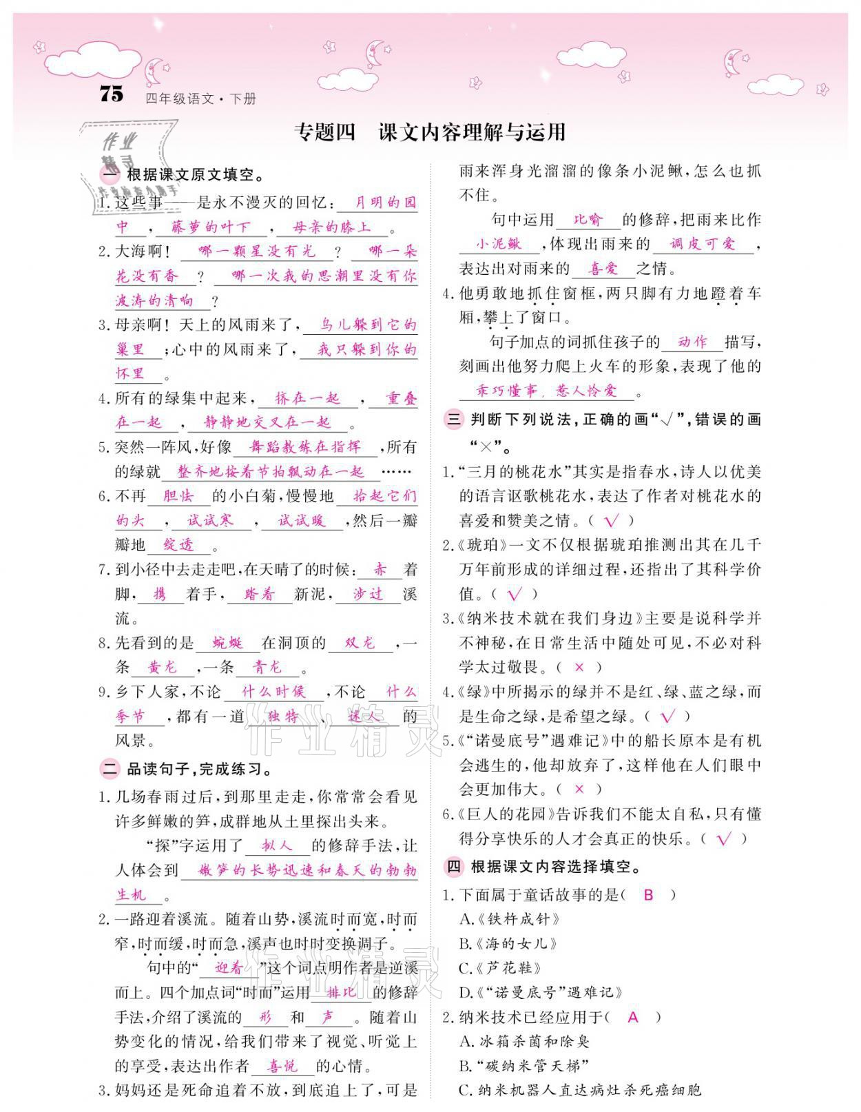 注:目前有些书本章节名称可能整理的还不是很完善,但都是按照顺序排列的,请同学们按照顺序仔细查找。练习册 2021年课堂点睛四年级语文下册人教版广东专版 答案主要是用来给同学们做完题方便对答案用的,请勿直接抄袭。