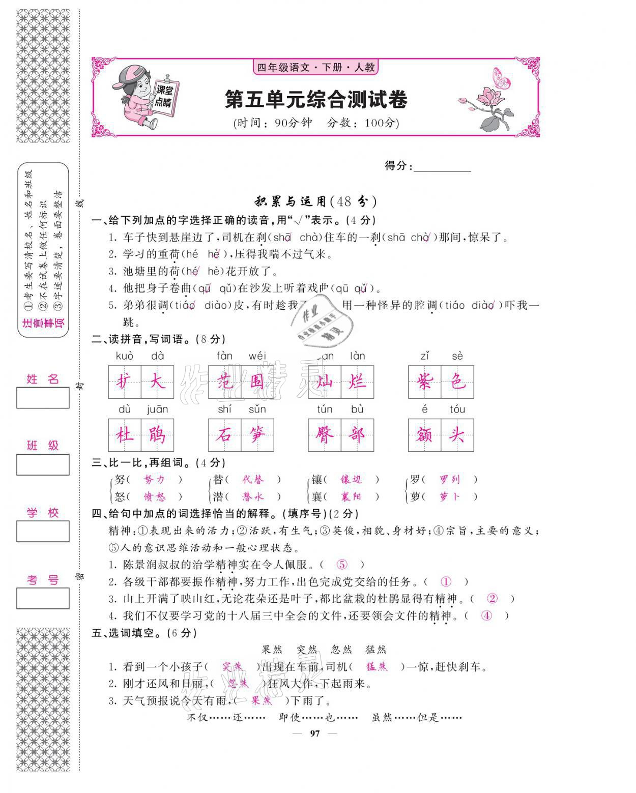 注:目前有些书本章节名称可能整理的还不是很完善,但都是按照顺序排列的,请同学们按照顺序仔细查找。练习册 2021年课堂点睛四年级语文下册人教版广东专版 答案主要是用来给同学们做完题方便对答案用的,请勿直接抄袭。