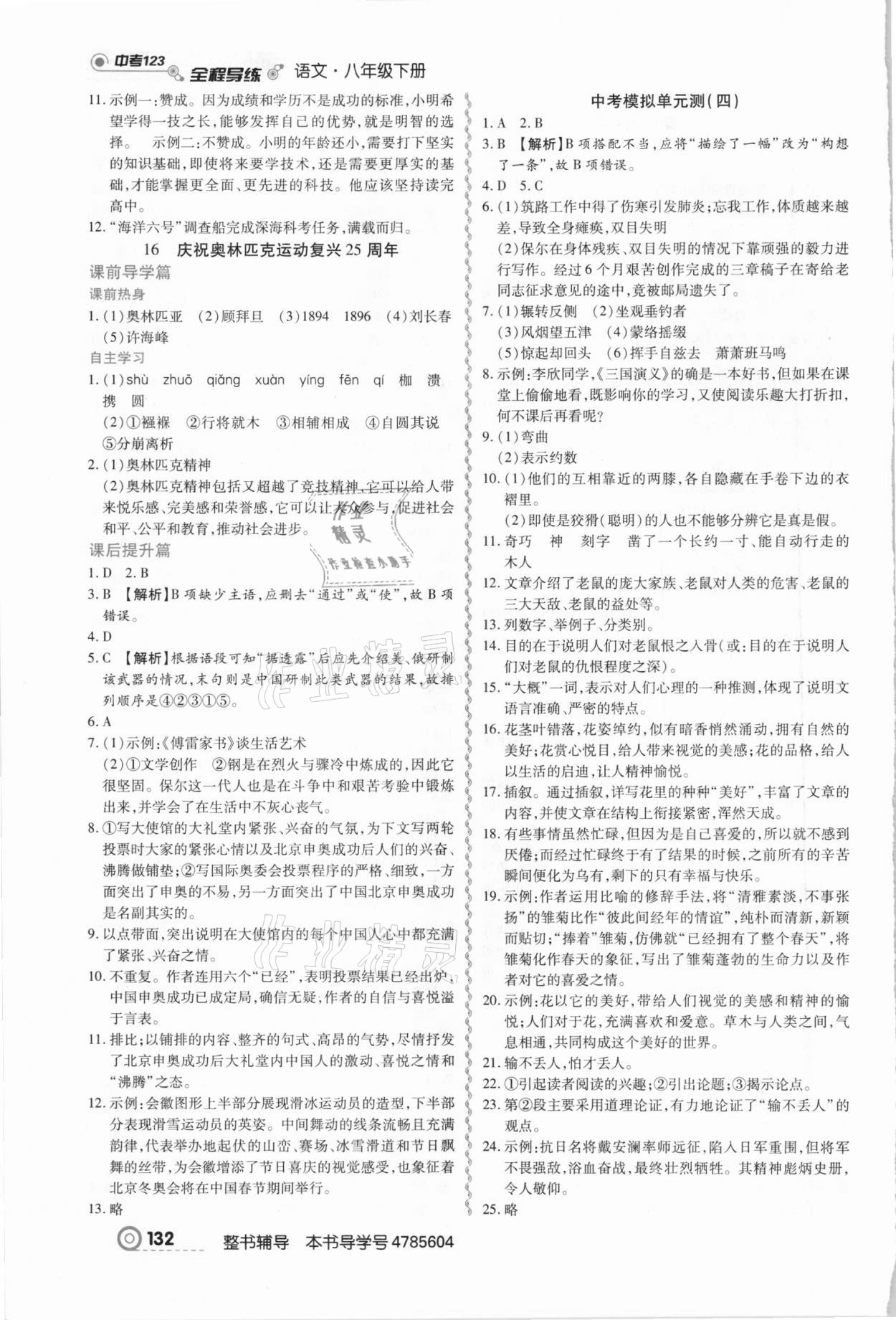 注:目前有些书本章节名称可能整理的还不是很完善,但都是按照顺序排列的,请同学们按照顺序仔细查找。练习册 2021年中考123全程导练八年级语文下册人教版 答案主要是用来给同学们做完题方便对答案用的,请勿直接抄袭。