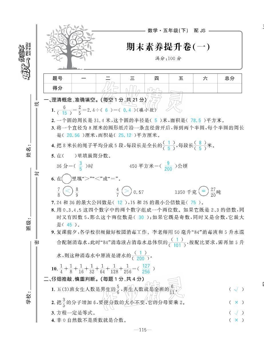 注:目前有些书本章节名称可能整理的还不是很完善,但都是按照顺序排列的,请同学们按照顺序仔细查找。练习册 2021年小学1课3练培优作业本五年级数学下册江苏版 答案主要是用来给同学们做完题方便对答案用的,请勿直接抄袭。