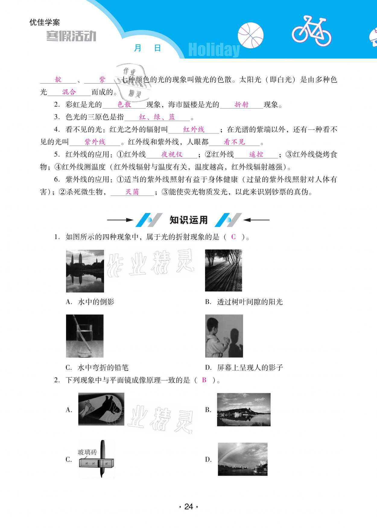 注:目前有些书本章节名称可能整理的还不是很完善,但都是按照顺序排列的,请同学们按照顺序仔细查找。练习册 2021年优佳学案寒假活动八年级物理人教版 答案主要是用来给同学们做完题方便对答案用的,请勿直接抄袭。