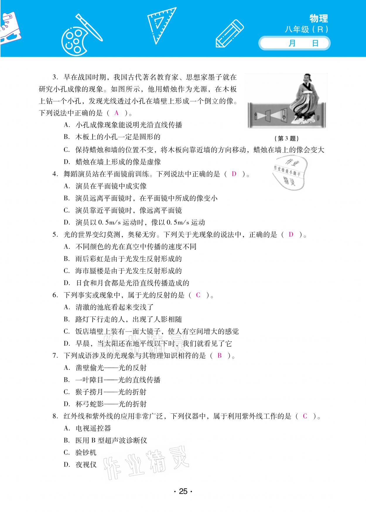 注:目前有些书本章节名称可能整理的还不是很完善,但都是按照顺序排列的,请同学们按照顺序仔细查找。练习册 2021年优佳学案寒假活动八年级物理人教版 答案主要是用来给同学们做完题方便对答案用的,请勿直接抄袭。