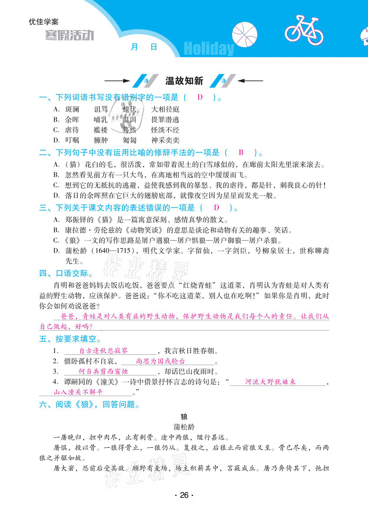 注:目前有些书本章节名称可能整理的还不是很完善,但都是按照顺序排列的,请同学们按照顺序仔细查找。练习册 2021年优佳学案寒假活动七年级语文人教版 答案主要是用来给同学们做完题方便对答案用的,请勿直接抄袭。