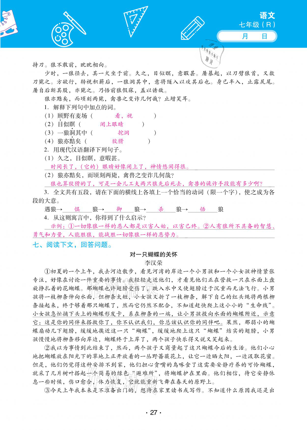 注:目前有些书本章节名称可能整理的还不是很完善,但都是按照顺序排列的,请同学们按照顺序仔细查找。练习册 2021年优佳学案寒假活动七年级语文人教版 答案主要是用来给同学们做完题方便对答案用的,请勿直接抄袭。