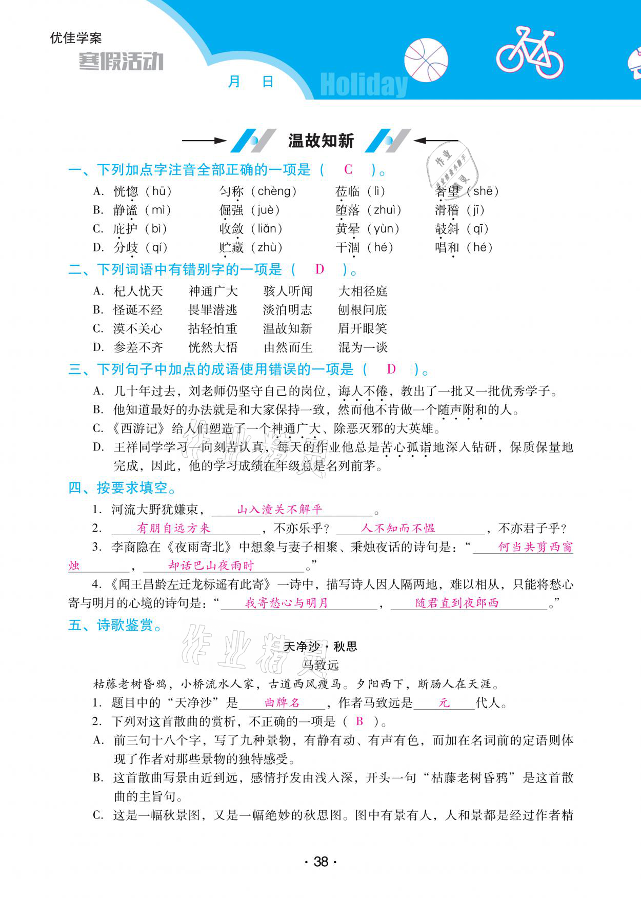 注:目前有些书本章节名称可能整理的还不是很完善,但都是按照顺序排列的,请同学们按照顺序仔细查找。练习册 2021年优佳学案寒假活动七年级语文人教版 答案主要是用来给同学们做完题方便对答案用的,请勿直接抄袭。