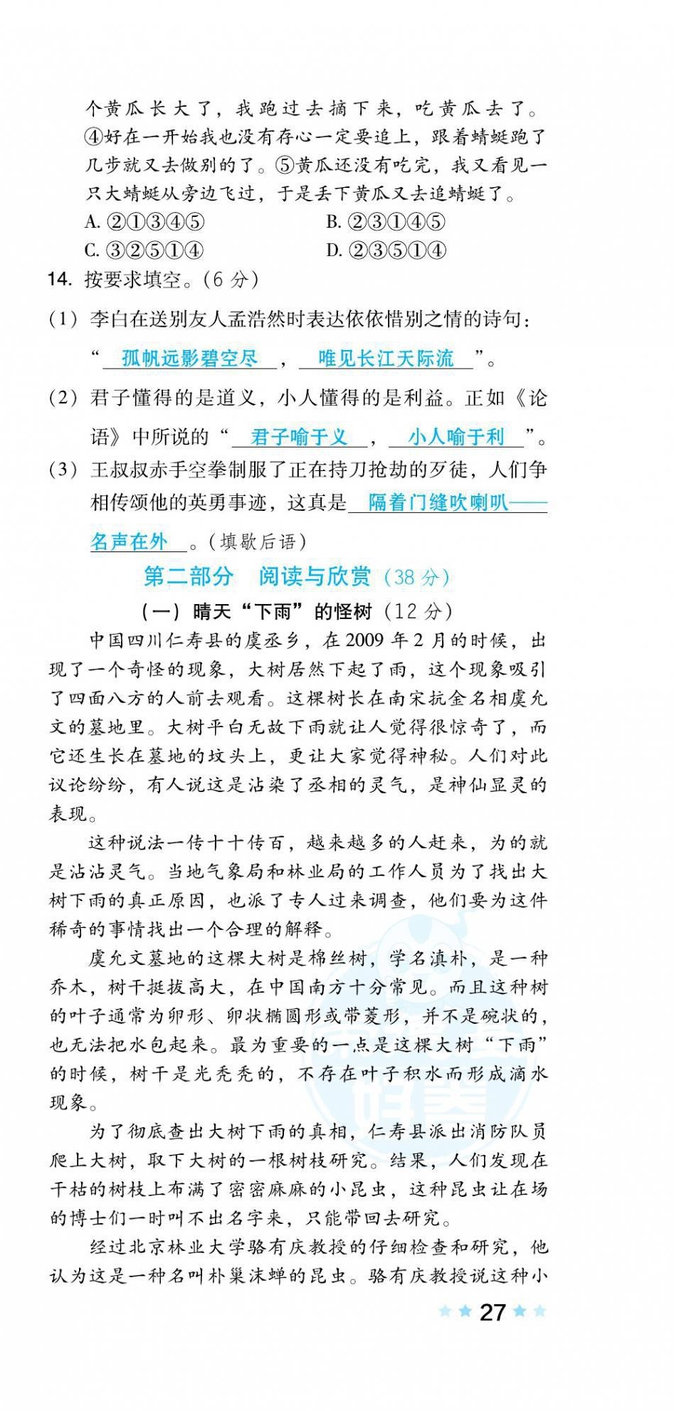 注:目前有些书本章节名称可能整理的还不是很完善,但都是按照顺序排列的,请同学们按照顺序仔细查找。练习册 2021年好卷五年级语文下册人教版福建专版 答案主要是用来给同学们做完题方便对答案用的,请勿直接抄袭。