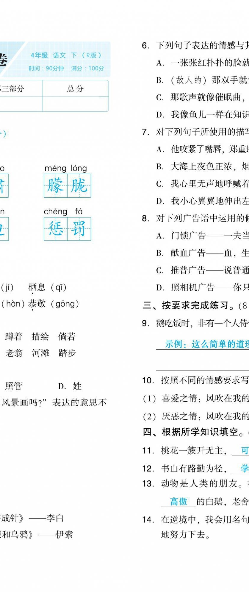 注:目前有些书本章节名称可能整理的还不是很完善,但都是按照顺序排列的,请同学们按照顺序仔细查找。练习册 2021年好卷四年级语文下册人教版福建专版 答案主要是用来给同学们做完题方便对答案用的,请勿直接抄袭。
