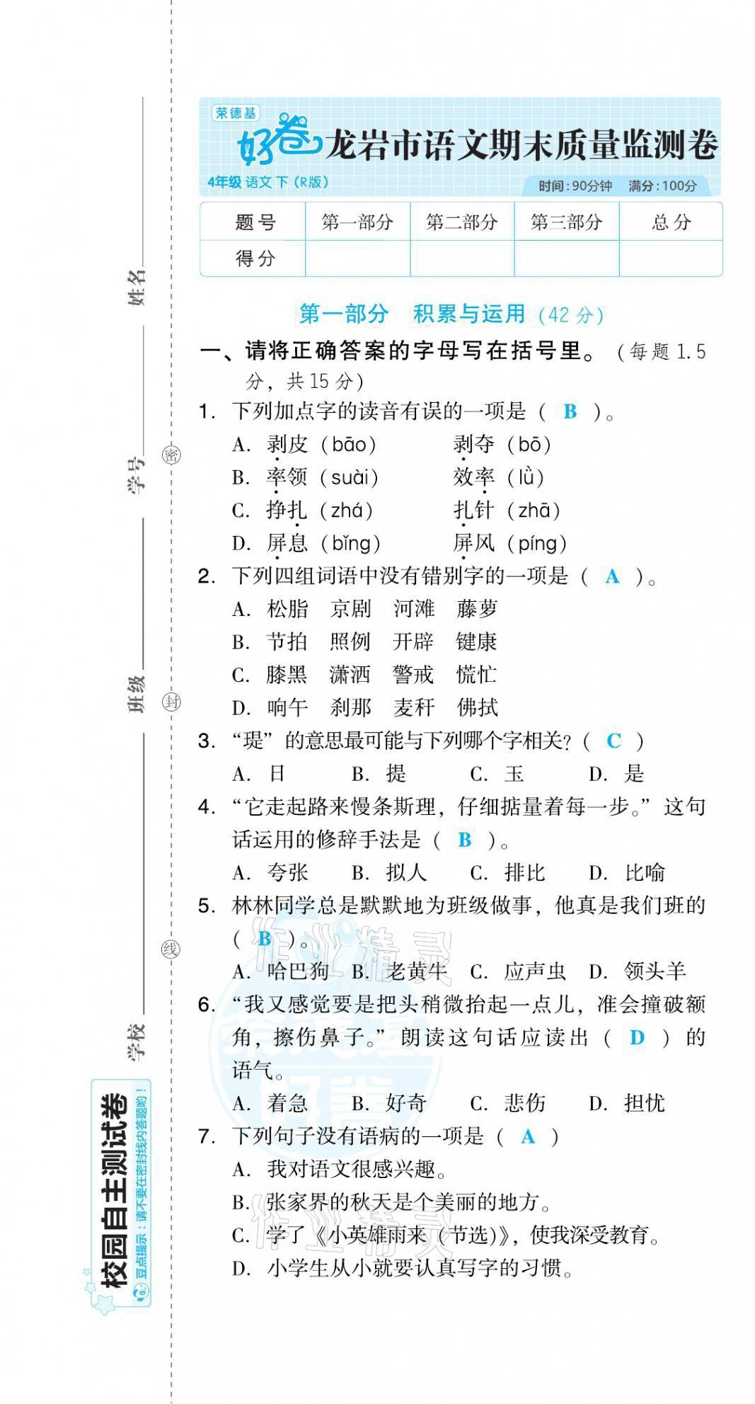 注:目前有些书本章节名称可能整理的还不是很完善,但都是按照顺序排列的,请同学们按照顺序仔细查找。练习册 2021年好卷四年级语文下册人教版福建专版 答案主要是用来给同学们做完题方便对答案用的,请勿直接抄袭。