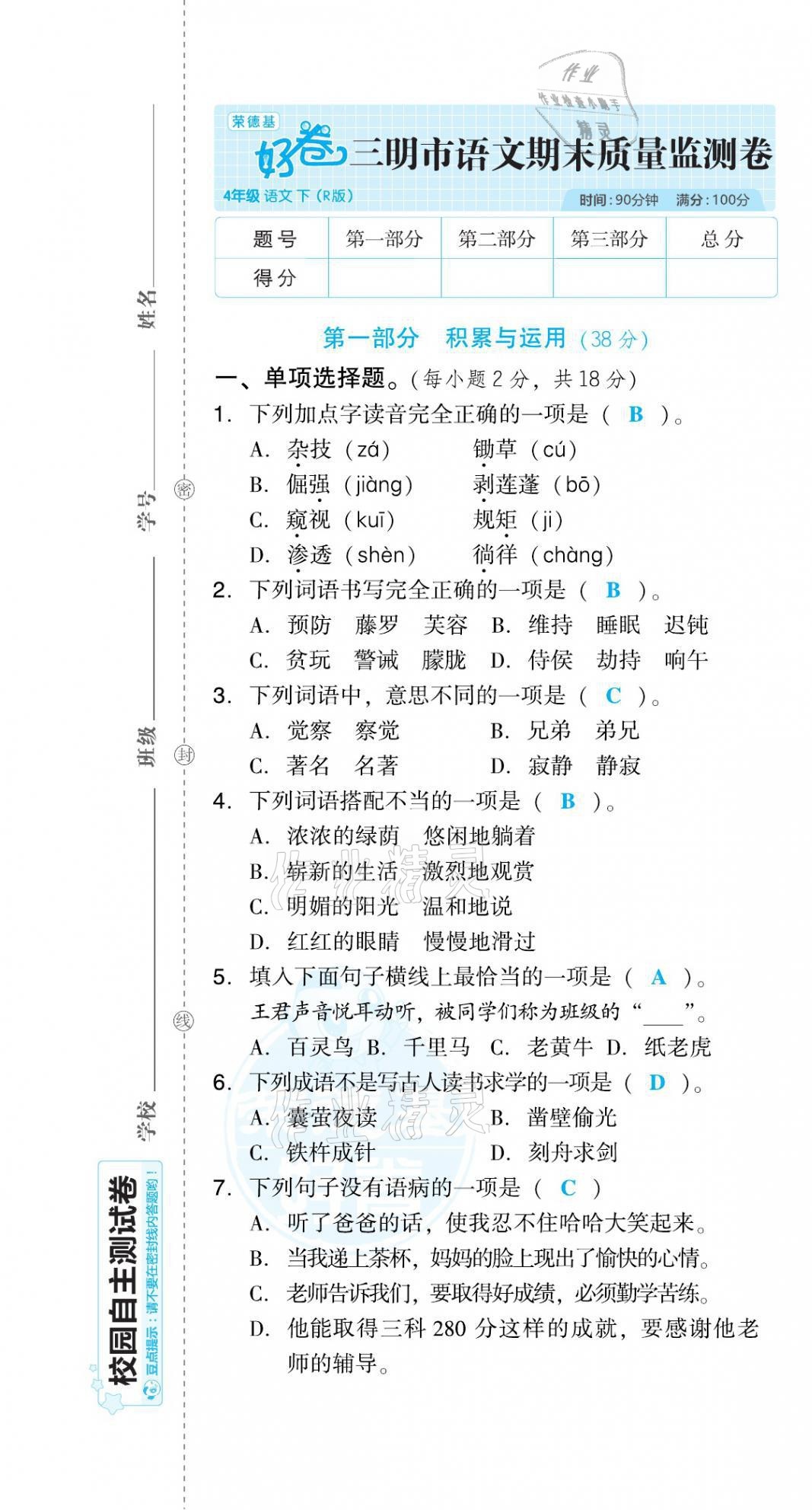 注:目前有些书本章节名称可能整理的还不是很完善,但都是按照顺序排列的,请同学们按照顺序仔细查找。练习册 2021年好卷四年级语文下册人教版福建专版 答案主要是用来给同学们做完题方便对答案用的,请勿直接抄袭。