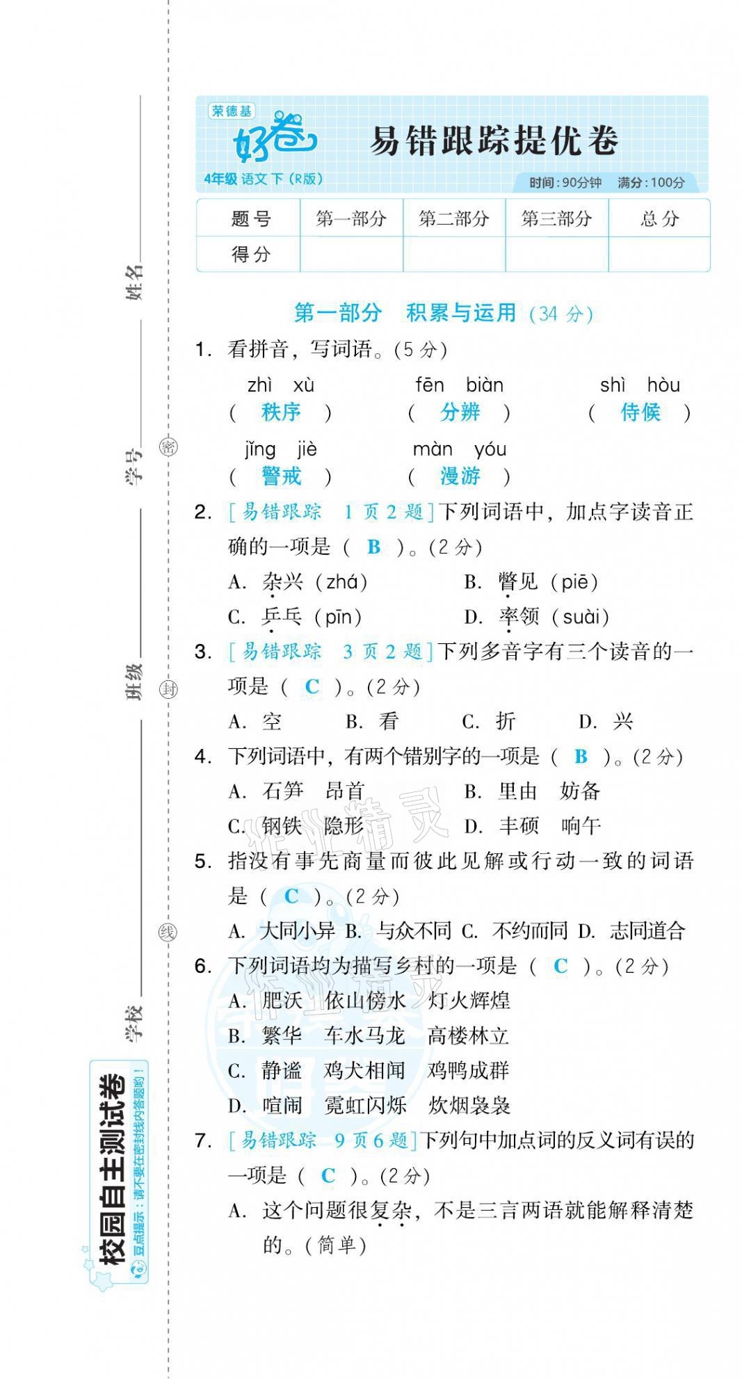 注:目前有些书本章节名称可能整理的还不是很完善,但都是按照顺序排列的,请同学们按照顺序仔细查找。练习册 2021年好卷四年级语文下册人教版福建专版 答案主要是用来给同学们做完题方便对答案用的,请勿直接抄袭。