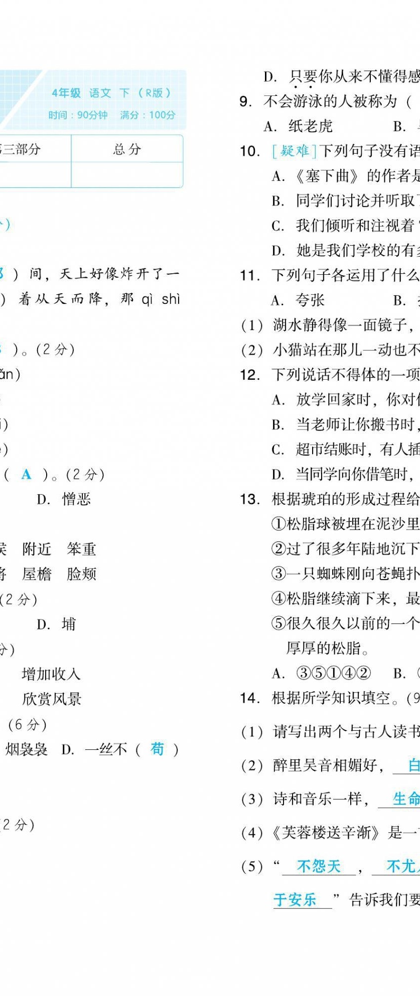 注:目前有些书本章节名称可能整理的还不是很完善,但都是按照顺序排列的,请同学们按照顺序仔细查找。练习册 2021年好卷四年级语文下册人教版福建专版 答案主要是用来给同学们做完题方便对答案用的,请勿直接抄袭。