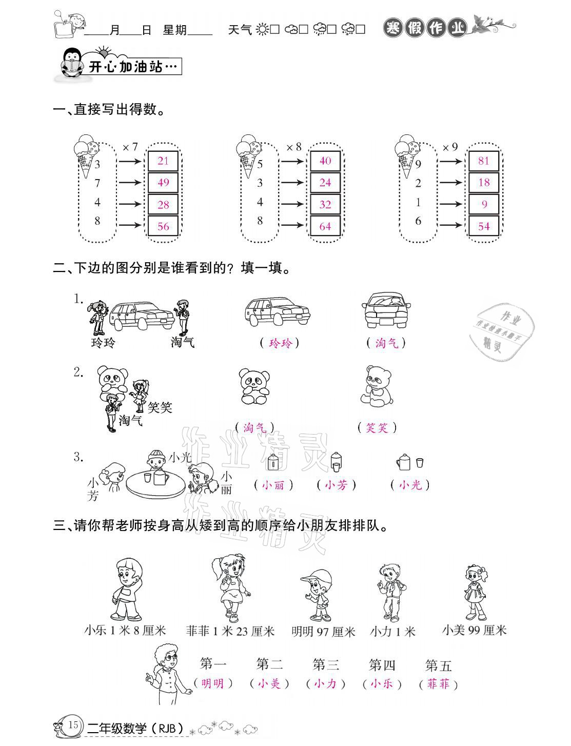 注:目前有些书本章节名称可能整理的还不是很完善,但都是按照顺序排列的,请同学们按照顺序仔细查找。练习册 2021年快乐假期寒假作业二年级数学人教版延边教育出版社 答案主要是用来给同学们做完题方便对答案用的,请勿直接抄袭。