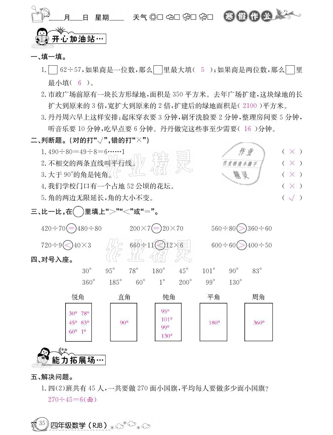 注:目前有些书本章节名称可能整理的还不是很完善,但都是按照顺序排列的,请同学们按照顺序仔细查找。练习册 2021年快乐假期寒假作业四年级数学人教版延边教育出版社 答案主要是用来给同学们做完题方便对答案用的,请勿直接抄袭。