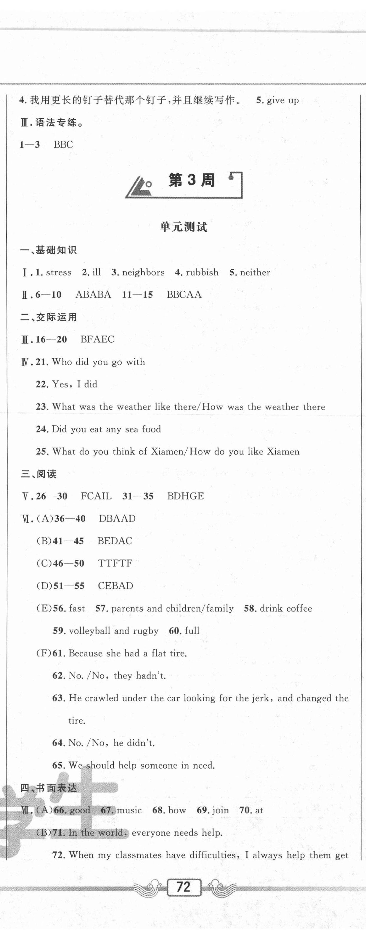 注:目前有些书本章节名称可能整理的还不是很完善,但都是按照顺序排列的,请同学们按照顺序仔细查找。练习册 2021年悦然好学生周周测八年级英语下册人教版 答案主要是用来给同学们做完题方便对答案用的,请勿直接抄袭。