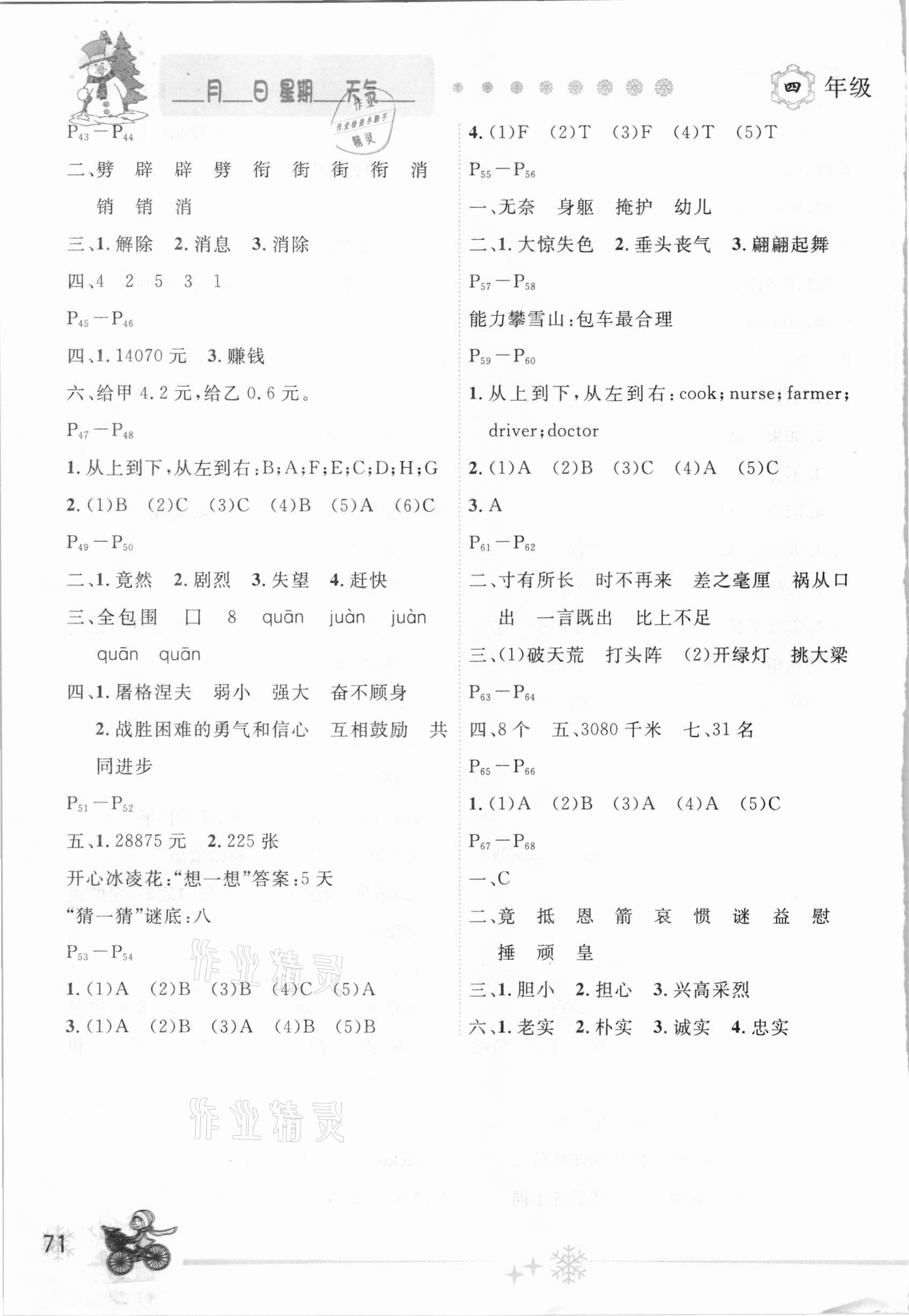 注:目前有些书本章节名称可能整理的还不是很完善,但都是按照顺序排列的,请同学们按照顺序仔细查找。练习册 2021年优秀生快乐假期每一天全新寒假作业本四年级综合人教版延边人民出版社 答案主要是用来给同学们做完题方便对答案用的,请勿直接抄袭。