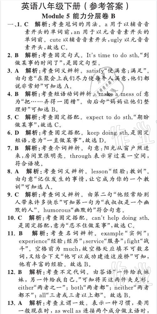 注:目前有些书本章节名称可能整理的还不是很完善,但都是按照顺序排列的,请同学们按照顺序仔细查找。练习册 2021年英语教材补充与练习质监天津单元检测卷八年级英语下册外研版 答案主要是用来给同学们做完题方便对答案用的,请勿直接抄袭。