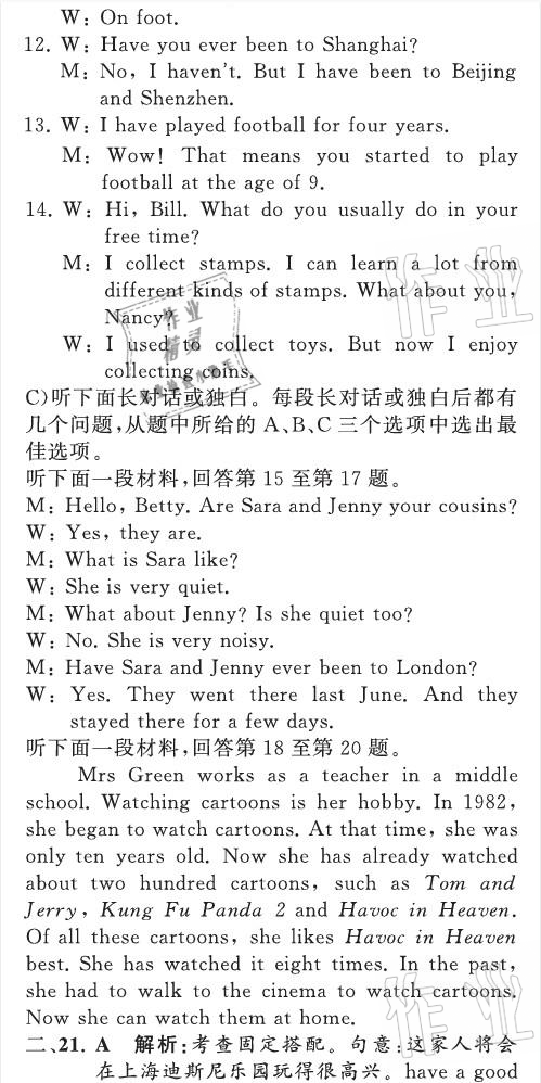 注:目前有些书本章节名称可能整理的还不是很完善,但都是按照顺序排列的,请同学们按照顺序仔细查找。练习册 2021年英语教材补充与练习质监天津单元检测卷八年级英语下册外研版 答案主要是用来给同学们做完题方便对答案用的,请勿直接抄袭。