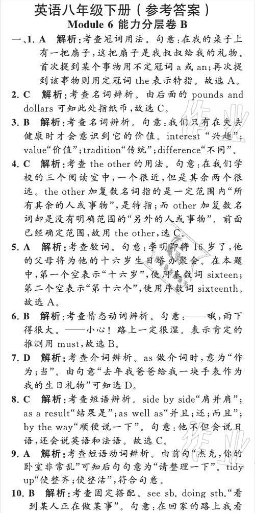 注:目前有些书本章节名称可能整理的还不是很完善,但都是按照顺序排列的,请同学们按照顺序仔细查找。练习册 2021年英语教材补充与练习质监天津单元检测卷八年级英语下册外研版 答案主要是用来给同学们做完题方便对答案用的,请勿直接抄袭。