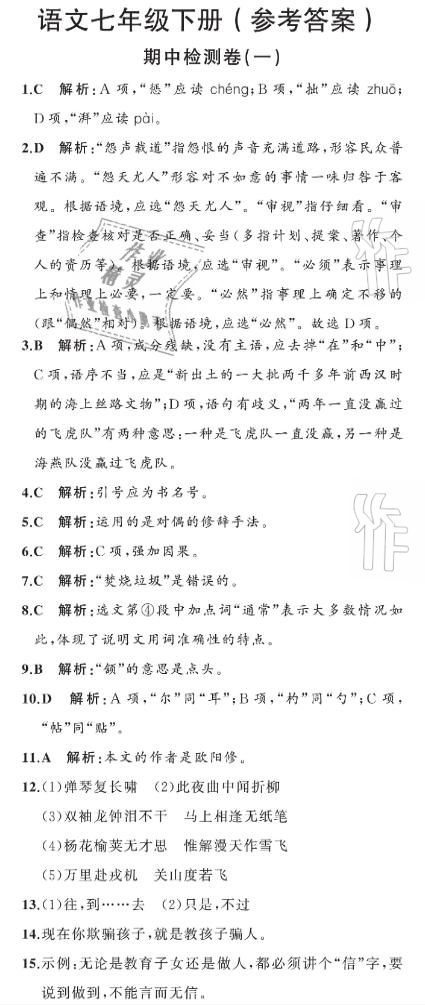 注:目前有些书本章节名称可能整理的还不是很完善,但都是按照顺序排列的,请同学们按照顺序仔细查找。练习册 2021年阳光课堂质监天津单元检测卷七年级语文下册人教版 答案主要是用来给同学们做完题方便对答案用的,请勿直接抄袭。