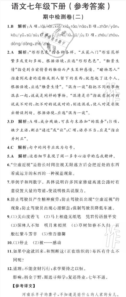 注:目前有些书本章节名称可能整理的还不是很完善,但都是按照顺序排列的,请同学们按照顺序仔细查找。练习册 2021年阳光课堂质监天津单元检测卷七年级语文下册人教版 答案主要是用来给同学们做完题方便对答案用的,请勿直接抄袭。