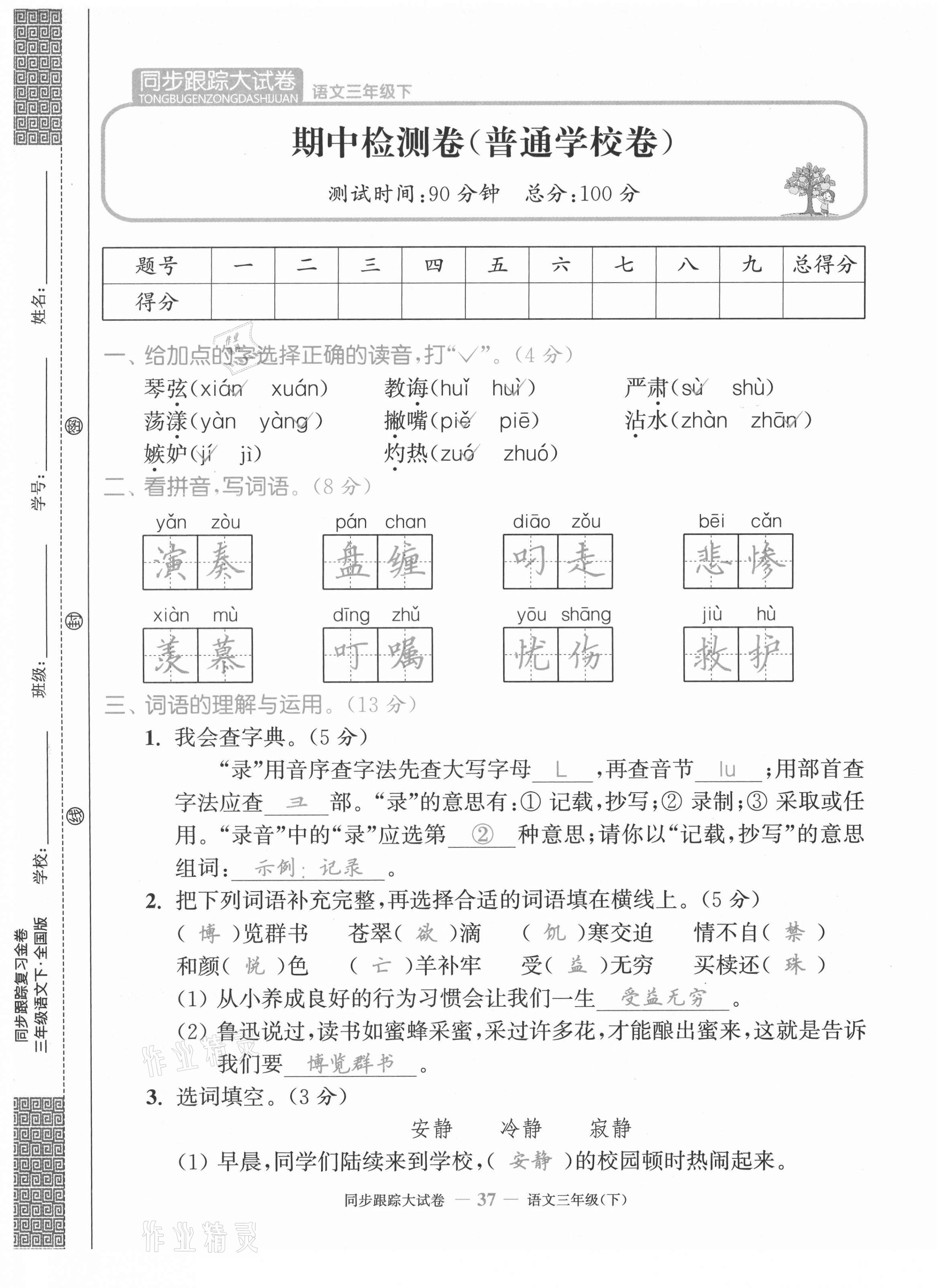 注:目前有些书本章节名称可能整理的还不是很完善,但都是按照顺序排列的,请同学们按照顺序仔细查找。练习册 2021年复习金卷同步跟踪大试卷三年级语文下册人教版 答案主要是用来给同学们做完题方便对答案用的,请勿直接抄袭。