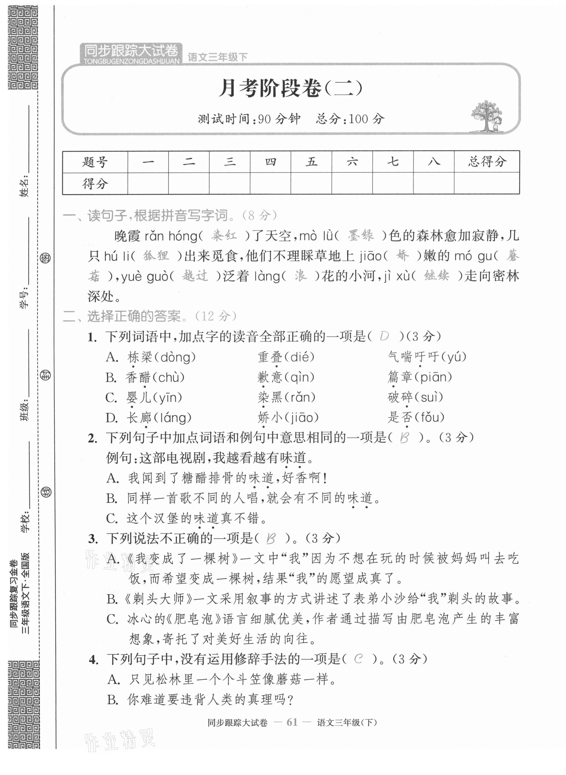 注:目前有些书本章节名称可能整理的还不是很完善,但都是按照顺序排列的,请同学们按照顺序仔细查找。练习册 2021年复习金卷同步跟踪大试卷三年级语文下册人教版 答案主要是用来给同学们做完题方便对答案用的,请勿直接抄袭。