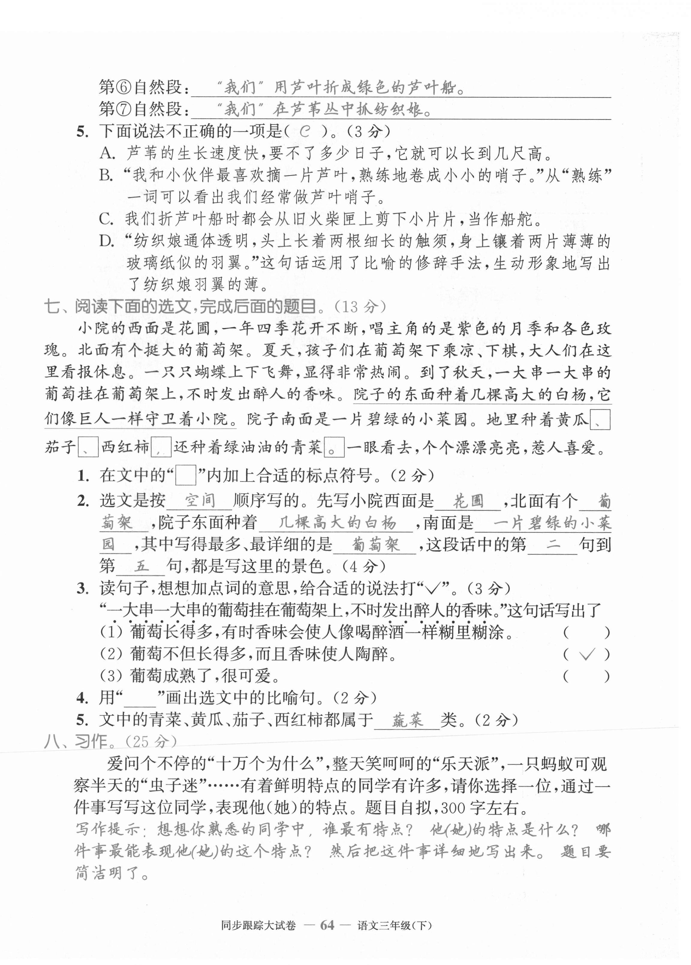 注:目前有些书本章节名称可能整理的还不是很完善,但都是按照顺序排列的,请同学们按照顺序仔细查找。练习册 2021年复习金卷同步跟踪大试卷三年级语文下册人教版 答案主要是用来给同学们做完题方便对答案用的,请勿直接抄袭。